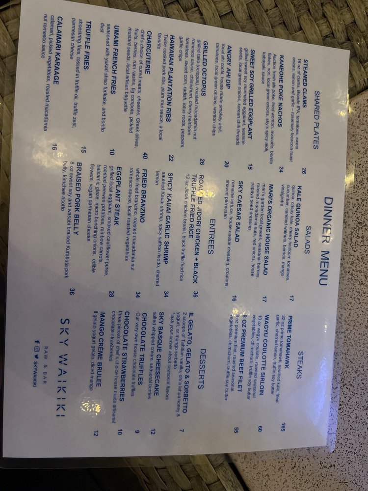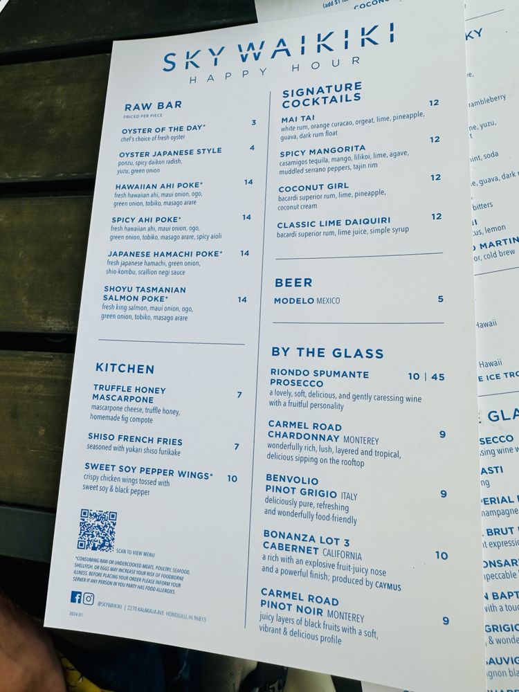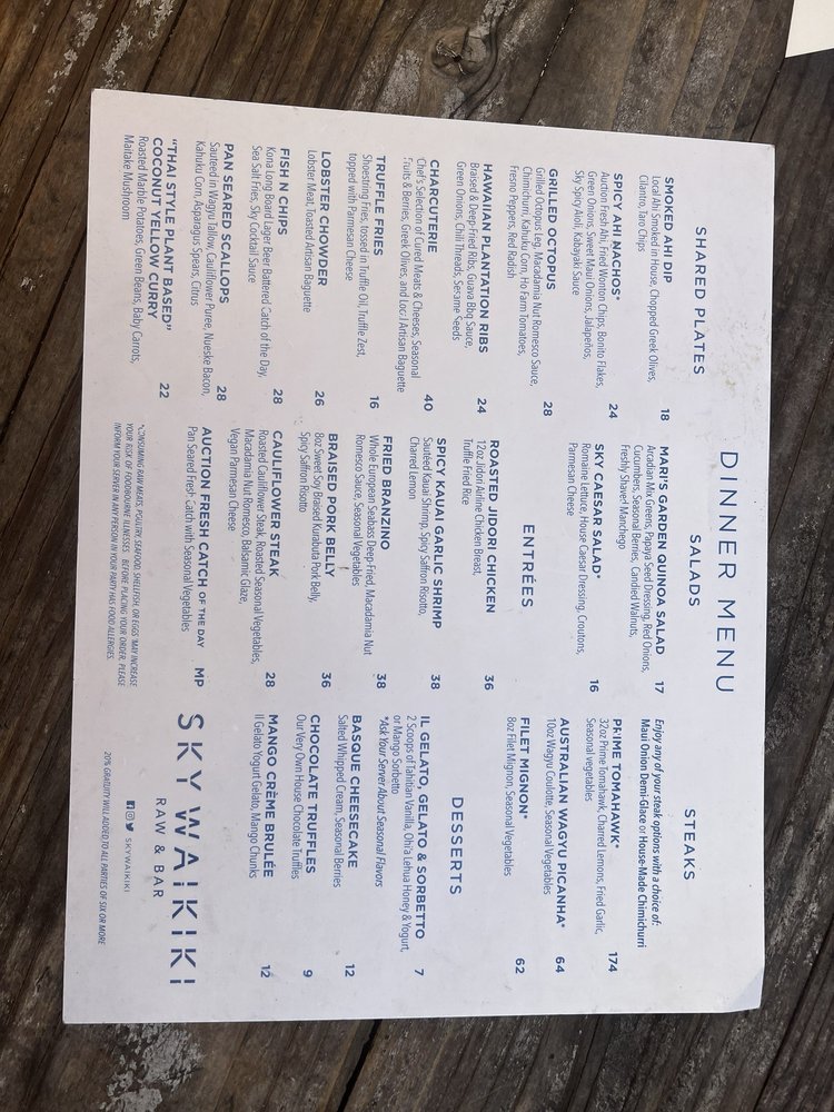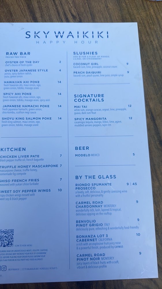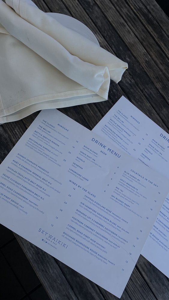 Introducing the menu of SKY Waikiki, a trendy champagne bar with seafood and cocktail offerings, located at 2270 Kalakaua Ave Fl 19 in Honolulu. This restaurant offers a wide range of oysters, sashimi, and sushi options. Customers rave about the delicious cocktails, especially the espresso martini, sakura drink, spicy mangorita, and coconut girl. The stunning views of Waikiki's skyline against the ocean backdrop add to the dining experience. Happy hour specials are a hit, but prices can be on the higher side even during this time. Overall, SKY Waikiki is a must-visit for those looking for a stylish setting, fresh seafood, and impeccable service.