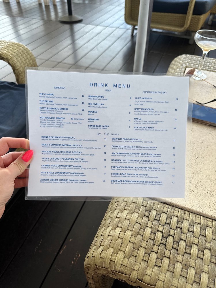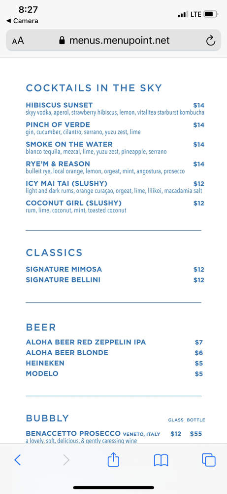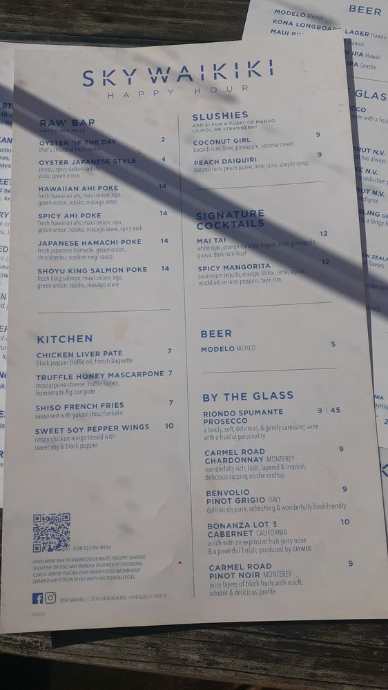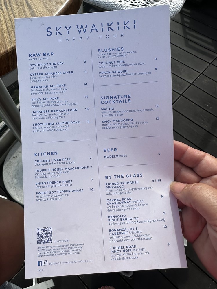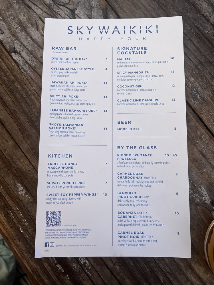 Introducing the menu of SKY Waikiki, a trendy champagne bar with seafood and cocktail offerings, located at 2270 Kalakaua Ave Fl 19 in Honolulu. This restaurant offers a wide range of oysters, sashimi, and sushi options. Customers rave about the delicious cocktails, especially the espresso martini, sakura drink, spicy mangorita, and coconut girl. The stunning views of Waikiki's skyline against the ocean backdrop add to the dining experience. Happy hour specials are a hit, but prices can be on the higher side even during this time. Overall, SKY Waikiki is a must-visit for those looking for a stylish setting, fresh seafood, and impeccable service.